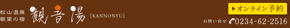 松山温泉 眺望の宿・観音湯 〒990-6812 山形県酒田市成興野須郷1-8 電話:0234-62-2516 ファックス:0234-62-2519